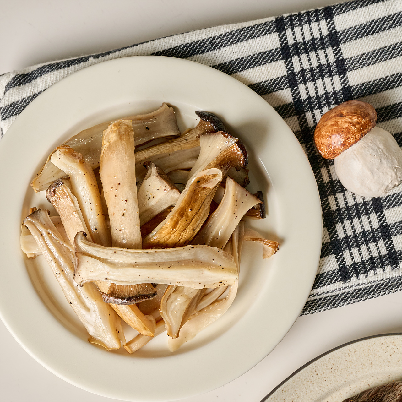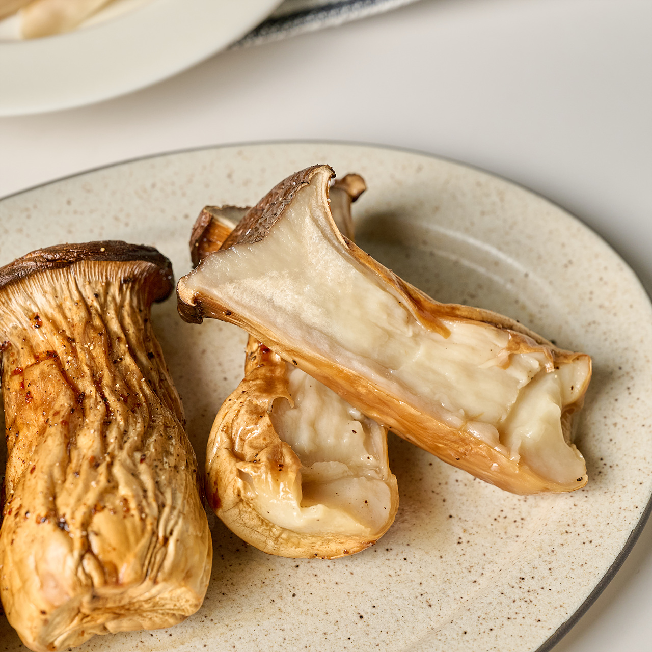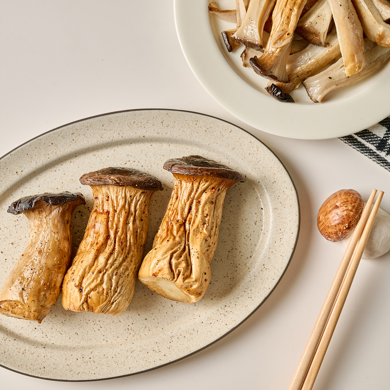 새송이는 1~2분 식힌 후, 가위를 이용해 1~2cm 두께로 어슷하게 자르거나, 손이나 집게로 결 방향대로 길게 찢어주세요. 후추를 곁들여 먹으면 좋아요.