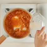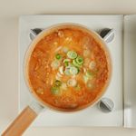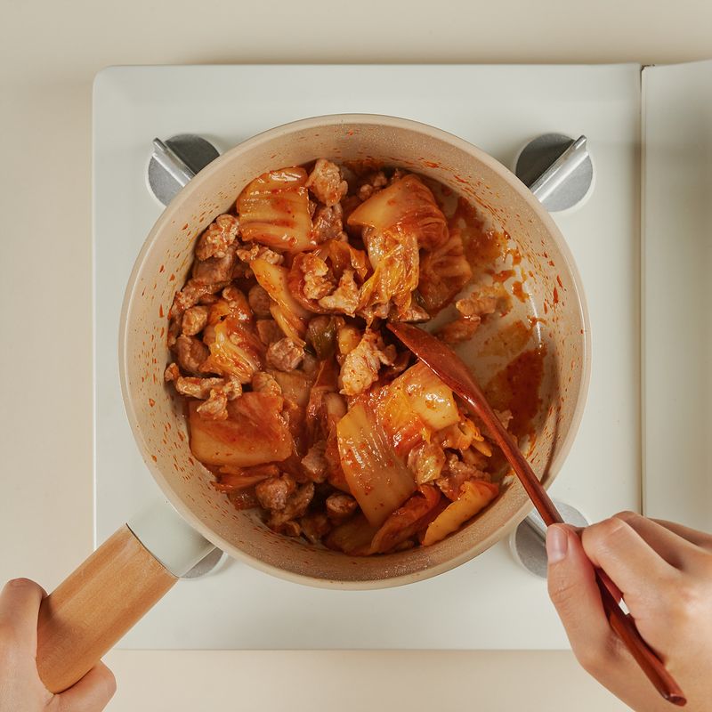 같은 냄비에 썰어둔 김치를 넣고 2분 동안 중불에서 볶아 주세요. 그다음 양념재료(연두진, 연두링, 다진 마늘, 김칫국물, 물)를 모두 넣고 센불에서 한소끔 끓인 후, 끓어오르면 중불로 줄여 2분 더 끓여주세요.