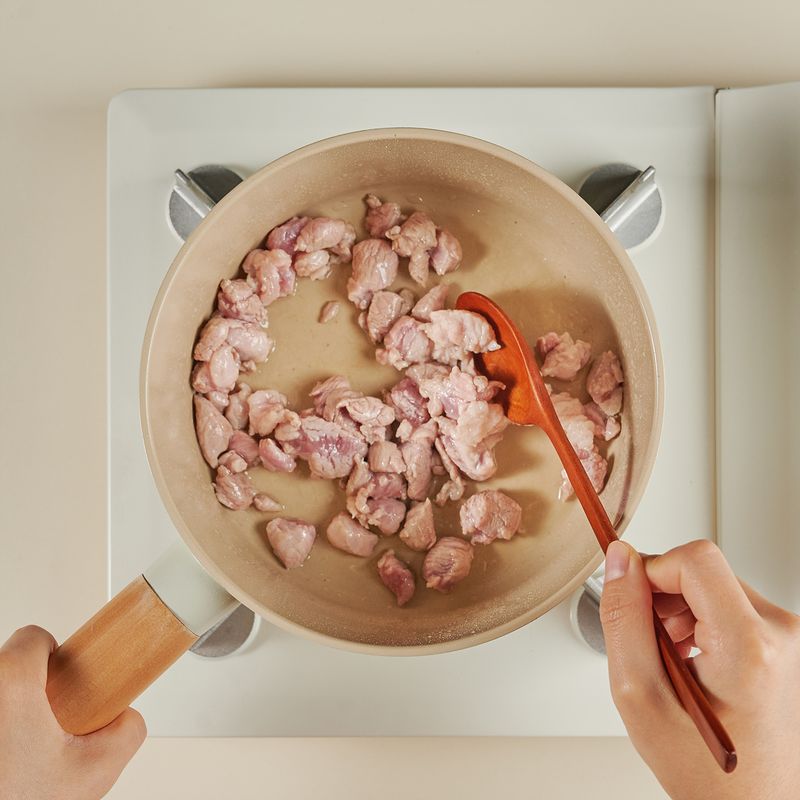 중불로 예열한 냄비에 식용유를 두르고, 돼지고기를 넣어 2분 동안 노릇노릇하게 볶아 주세요.