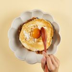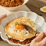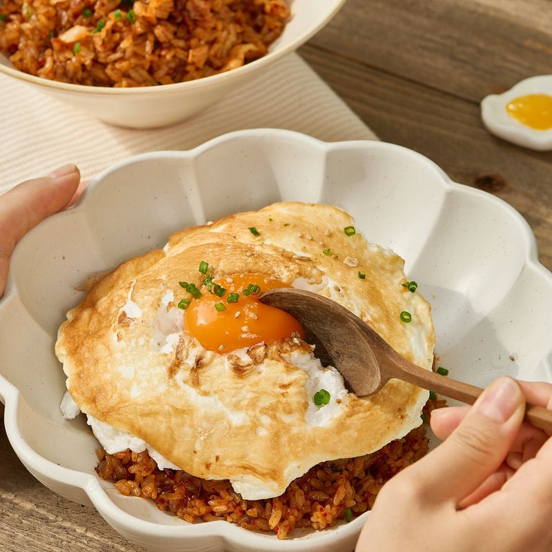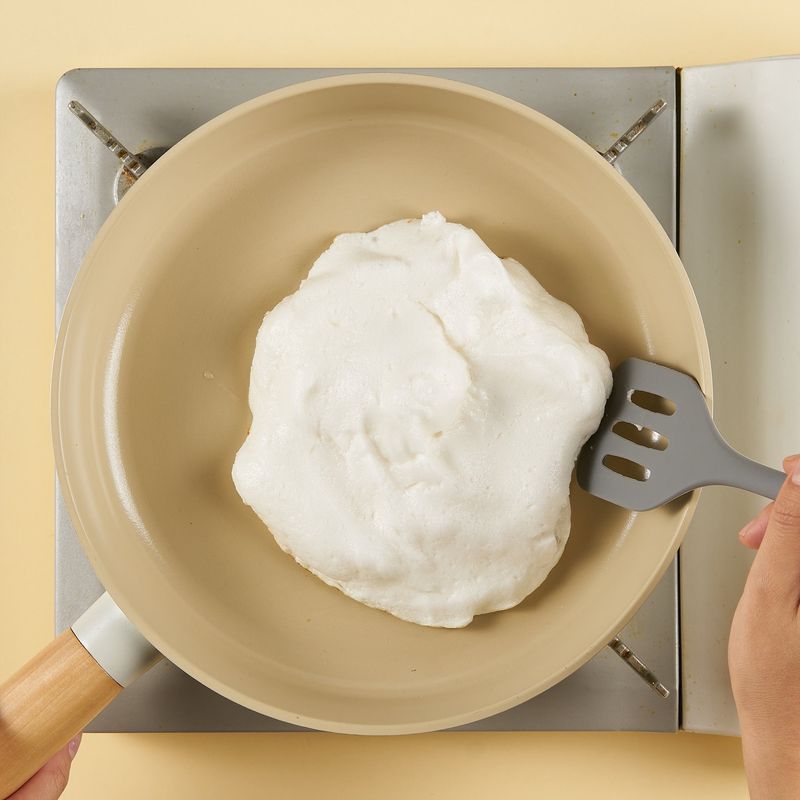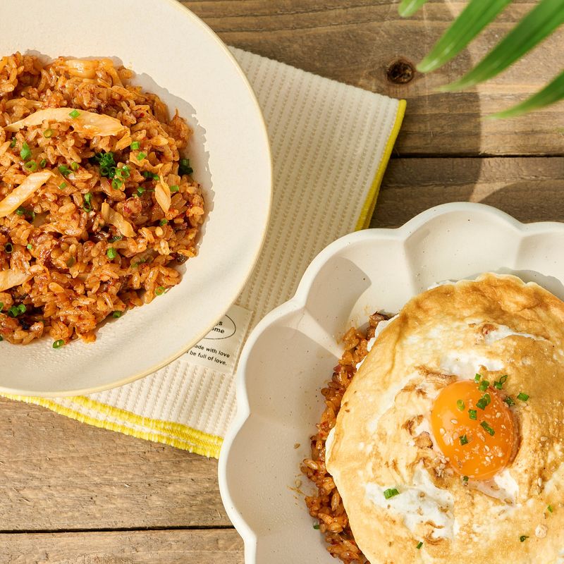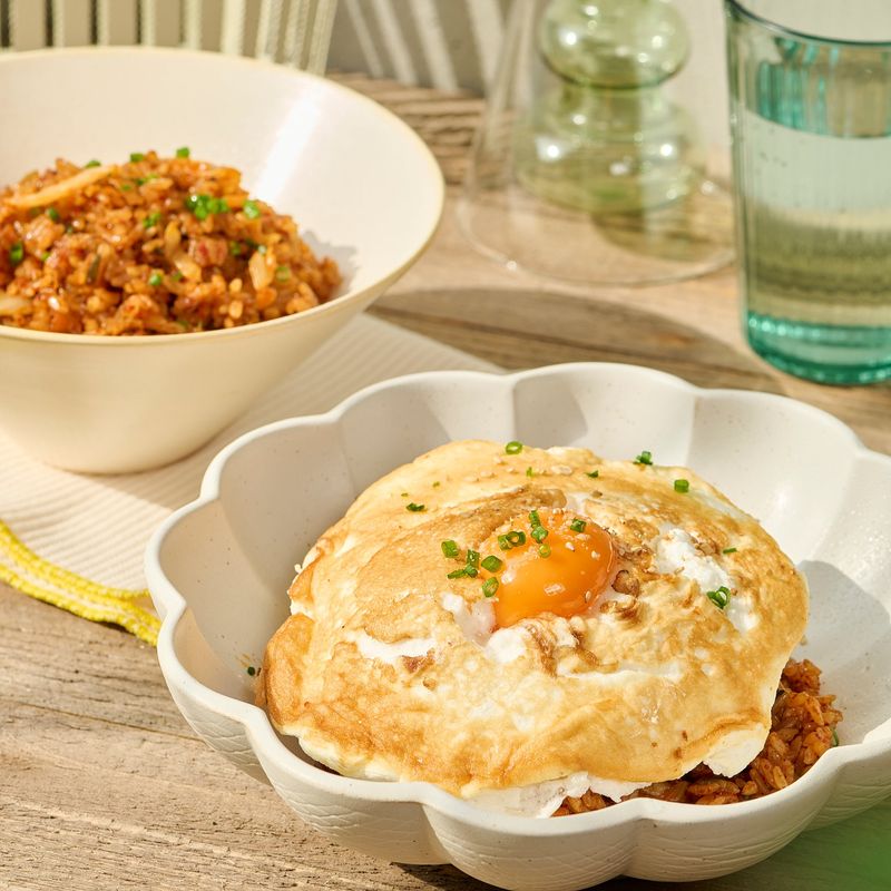 약불로 예열한 팬에 식용유 2스푼을 두른 후, 머랭을 넣어 약불에서 약 1분간 한쪽 면만 구워주세요. 완성된 김치볶음밥 위에 구운 머랭을 올려주고, 남은 노른자를 올려주면 완성!
