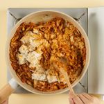 중불로 예열한 팬에 마가린을 넣은 다음 김치를 넣어 약 1~2분간 볶아준 후, 연두순을 넣고 김치가 숨이 죽을 때까지 약 2분간 더 볶아주세요. 밥을 넣은 후, 약 2~3분간 더 볶아주면 완성!