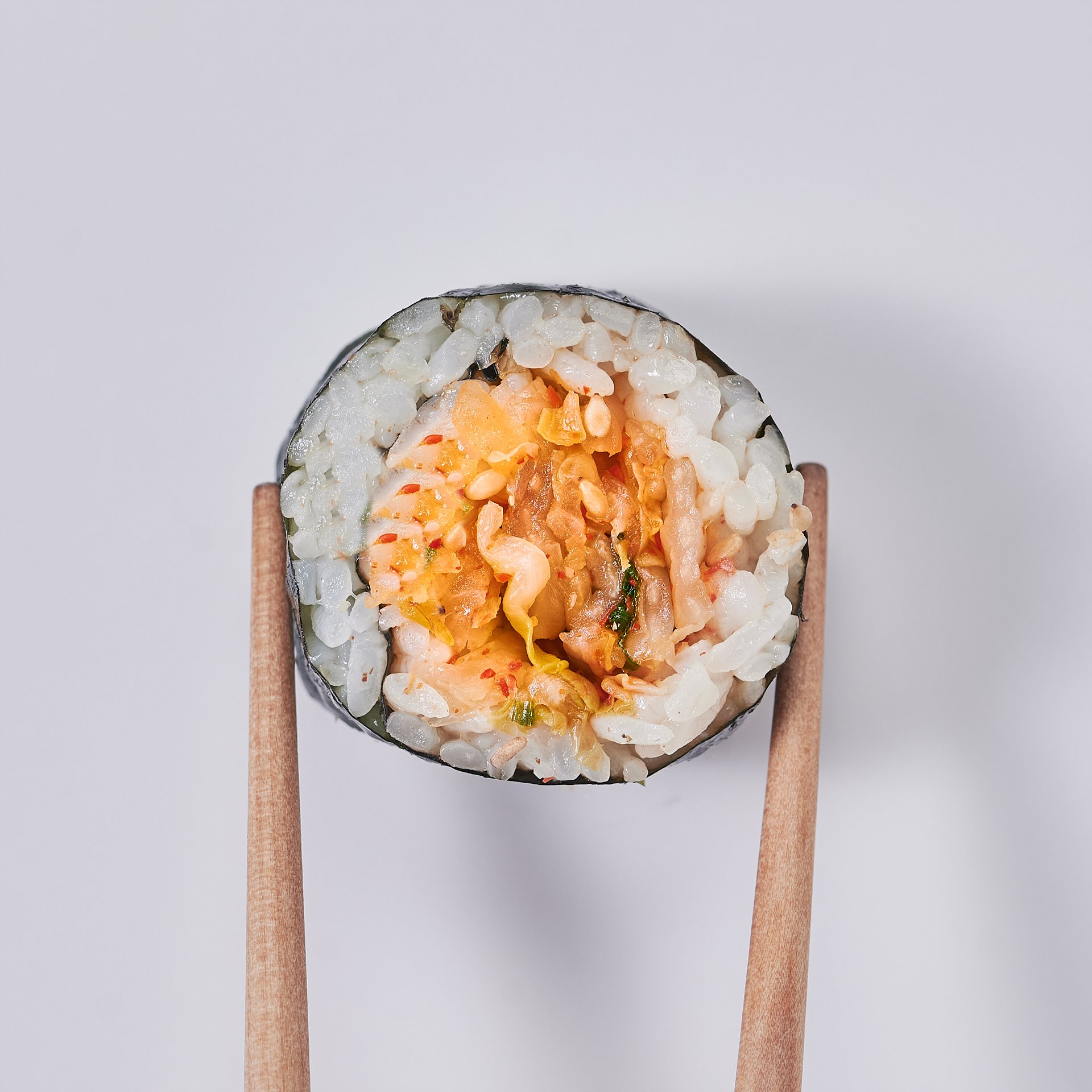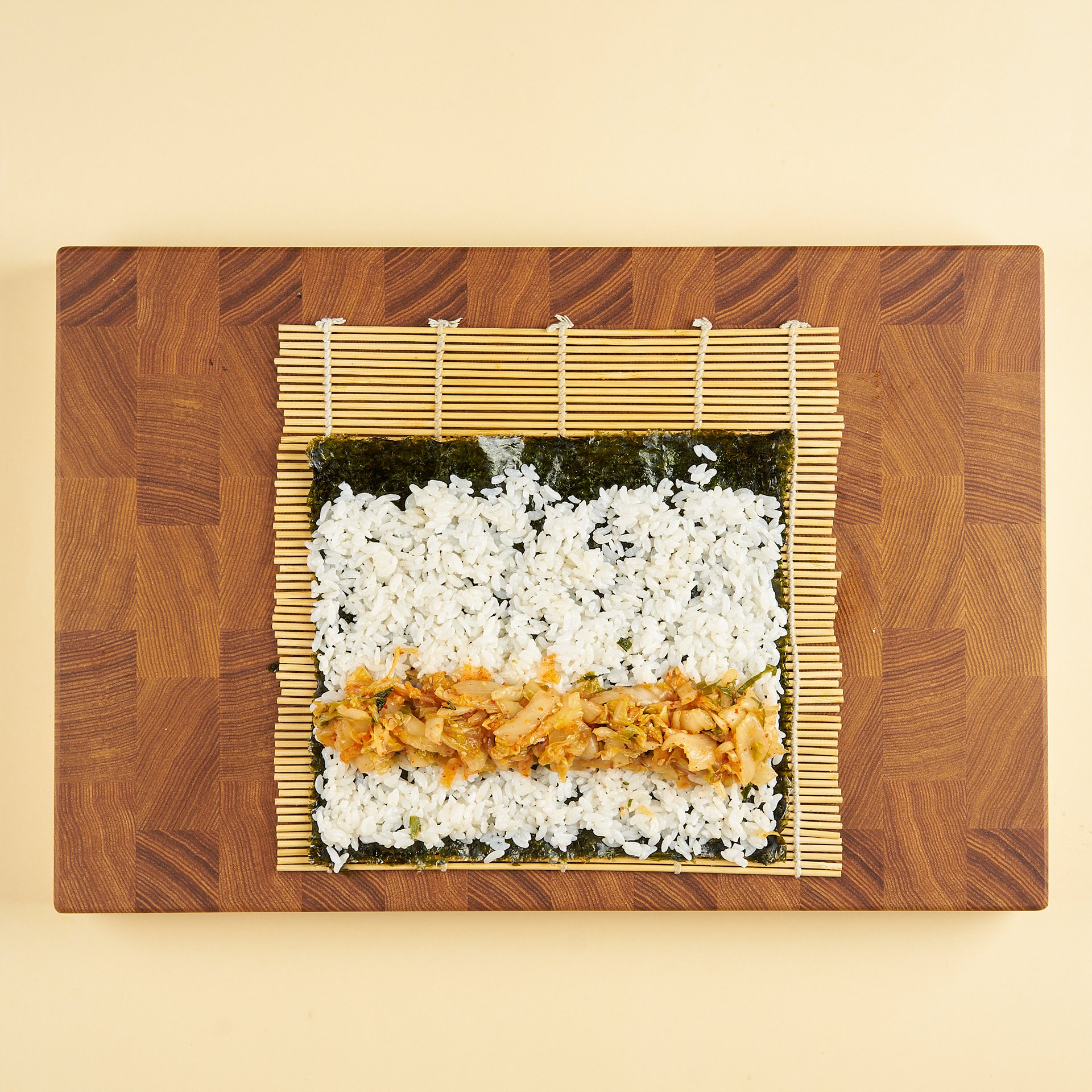 김에 밥을 넓게 펴고 준비한 김치를 올려 김발에 말아주면 완성!