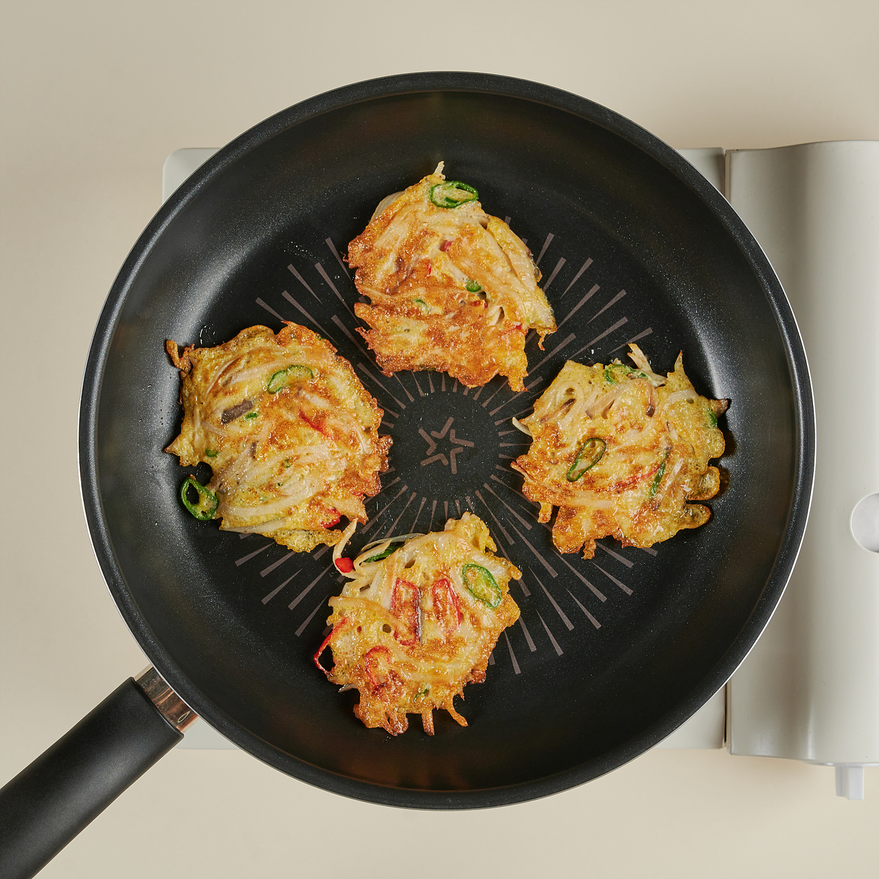 중불로 예열한 팬에 포도씨유를 두르고, 손바닥만 한 크기(7~8cm)로 반죽을 동그랗게 올려주세요. 앞면과 뒷면을 각각 3~5분씩 노릇노릇하게 부쳐주면 완성!