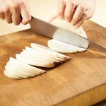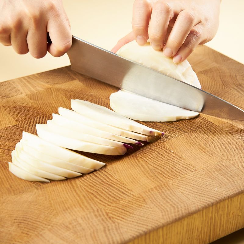 콜라비 잎과 뿌리를 제거하고 깨끗이 씻은 후, 칼 또는 감자칼로 껍질을 벗겨주세요. 반으로 갈라 2등분 해 주고, 평평한 면이 아래로 가게 놓은 후, 1cm 두께 반달모양으로 썰어주세요. 반달모양으로 잘린 콜라비를 2~3등분해 부채꼴 모양으로 손질해 주세요.