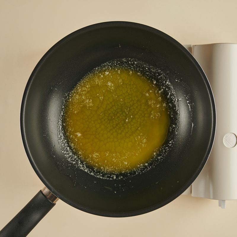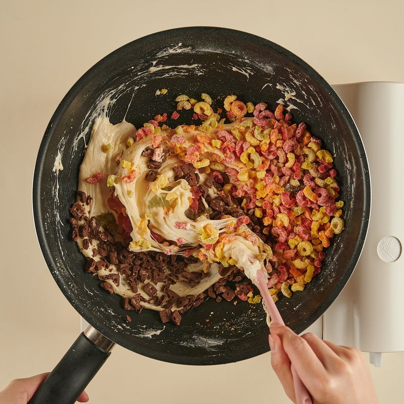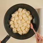 코팅팬에 버터를 넣고 약불에서 약 2분간 천천히 녹여주고, 마시멜로를 넣어 잘 저어주며 약 2분 동안 완전히 녹여주세요.