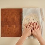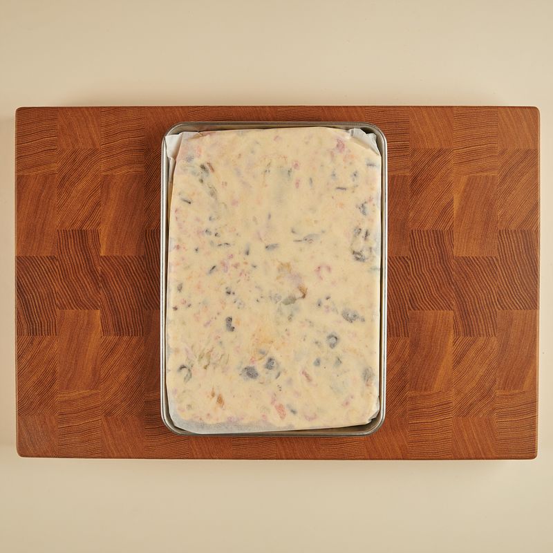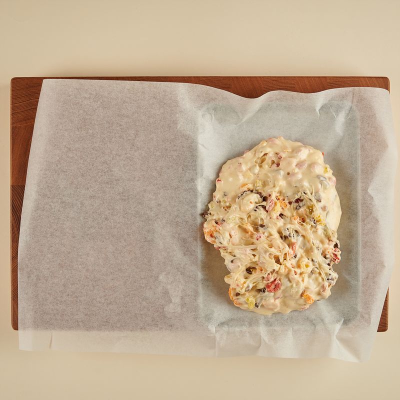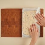 도마 위에 종이호일을 깔고 그 위에 섞은 재료들을 모두 부어 주세요. 위에 종이호일을 한 번 더 깔아 손으로 꾹꾹 눌러서 평평한 모양을 만들고 냉동실에서 20-30분 동안 굳혀주세요.