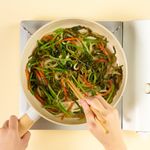 볶고 있는 재료에 새미네 잡채소스를 넣어 1분간 중불에서 졸여주세요.