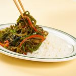 그릇에 밥을 담은 후, 미역줄기 볶음을 올려주면 완성!