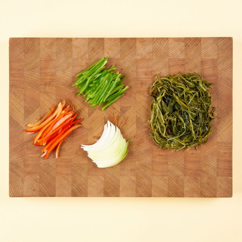 미역줄기는 4cm 길이로 썰고, 양파와 홍, 청피망은 0.5cm 두께로 채썰어 주세요.
