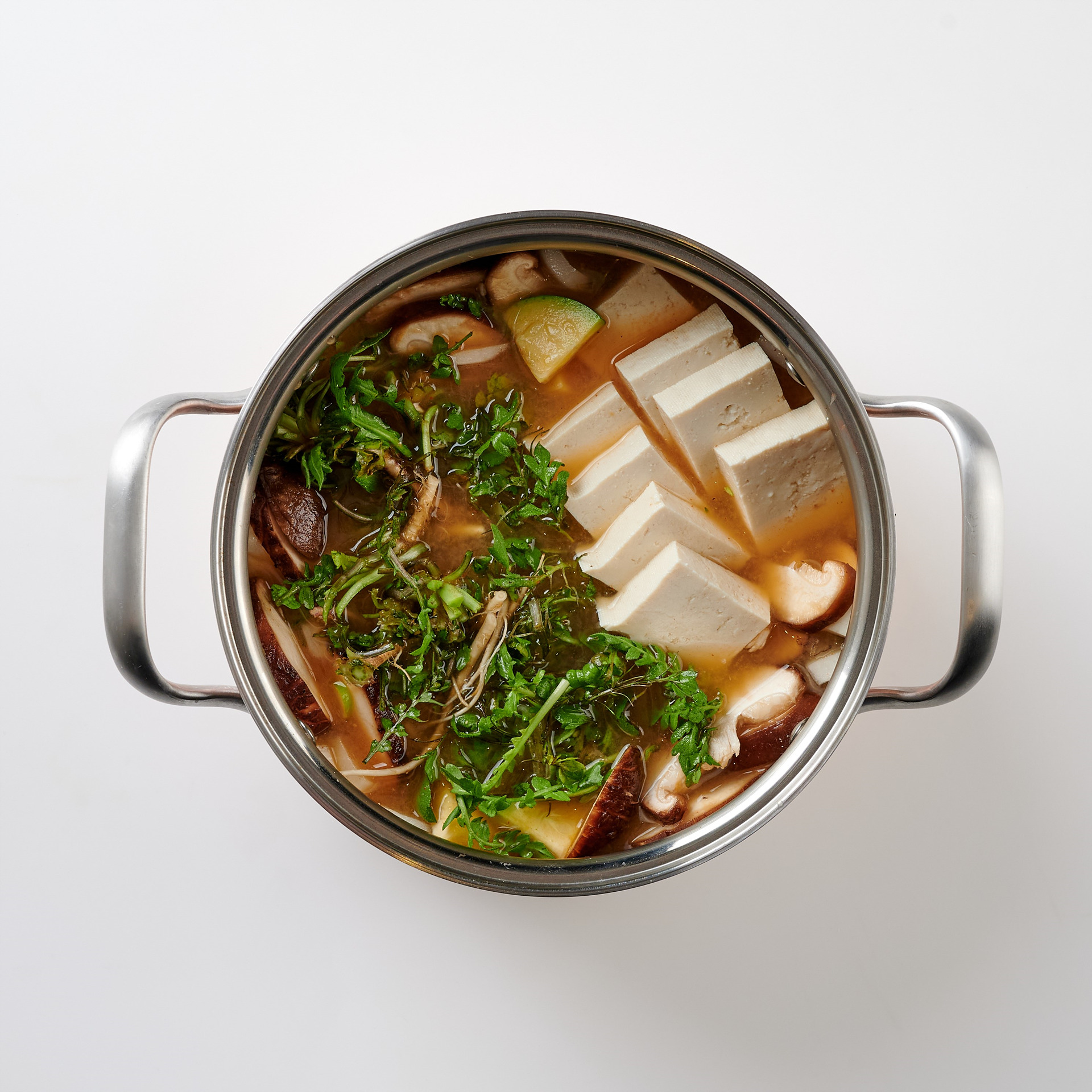 물이 한소끔 끓으면 두부, 표고버섯, 양파, 애호박, 냉이를 넣고 끓여 주세요. 재료가 모두 익으면 대파, 풋고추를 넣어 더 끓여주면 완성!