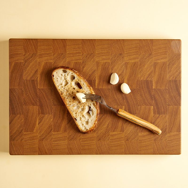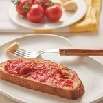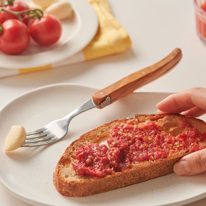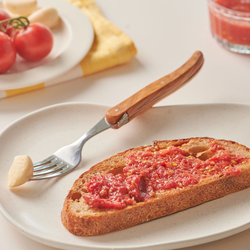 바삭하게 구운 바게트 위,마늘과 토마토를 차례로 바른 후올리브유와 소금, 후추를 가볍게 두르면 한 끼 완성!