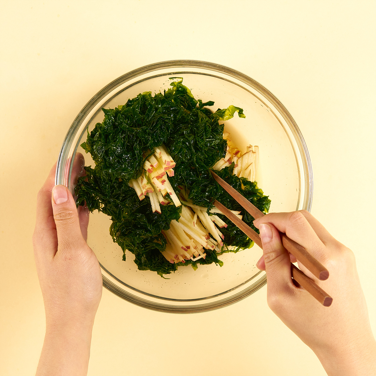 볼에 연두순, 설탕, 식초를 넣고 잘 섞다가 준비한 사과와 파래를 넣고 무치면 완성!