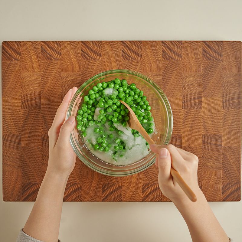 완두콩에 물, 설탕을 넣어 설탕이 녹을 때까지 섞어주고, 랩을 씌워 전자레인지에 넣고 7분~7분 30초간(1,000W 기준) 조리해 주세요.