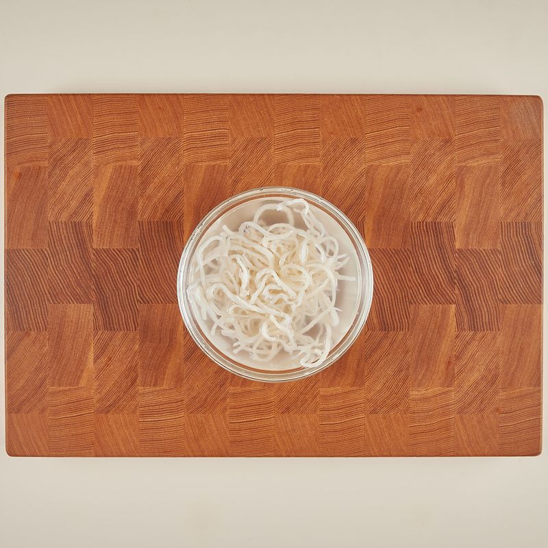 진미채는 찬물에 1분 정도 담가둔 후, 손으로 물기를 꽉 짜 주세요.