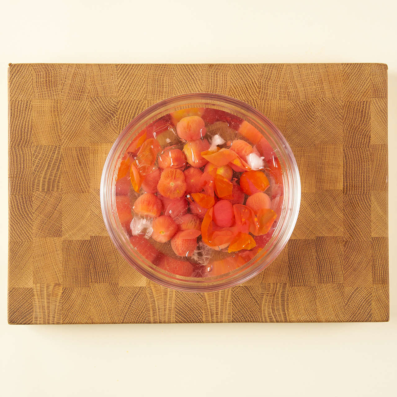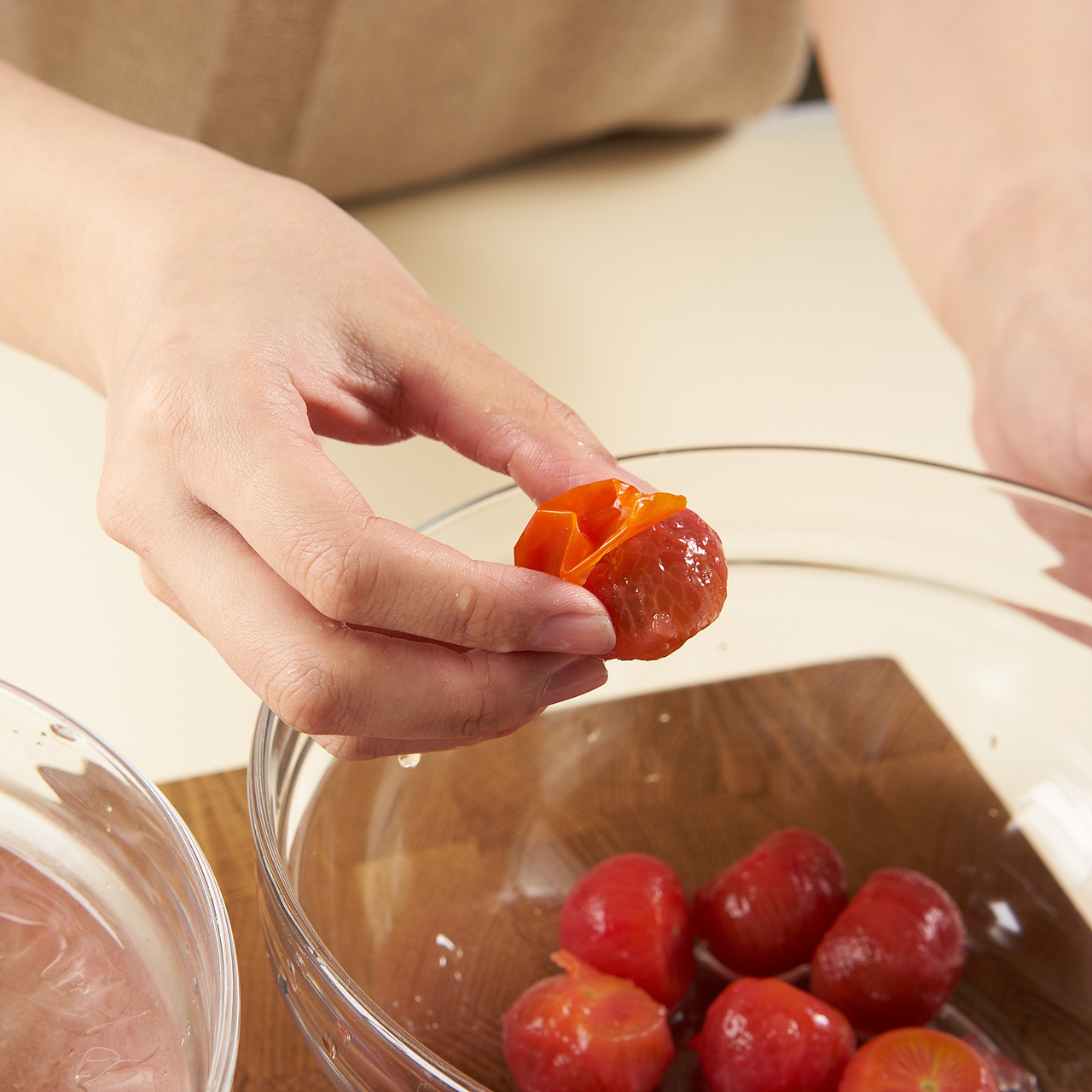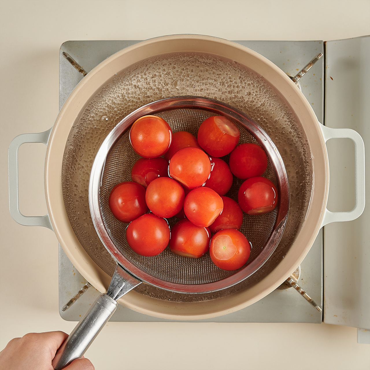 손질한 토마토는 끓는 물에 30초 정도 넣어 데친 후, 찬물에 담가 손이나 칼로 껍질을 벗겨 주세요.