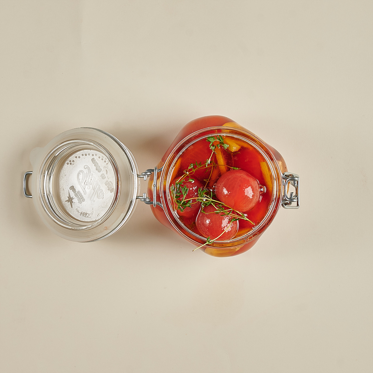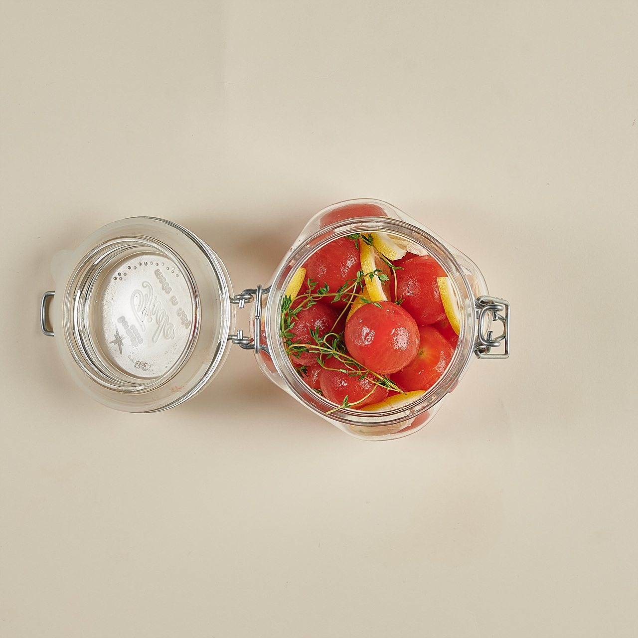 소독한 절임용 유리병에 껍질을 깐 방울토마토와 레몬, 허브를 넣어주세요. 매실청을 토마토가 잠길 정도로 부어 주세요.