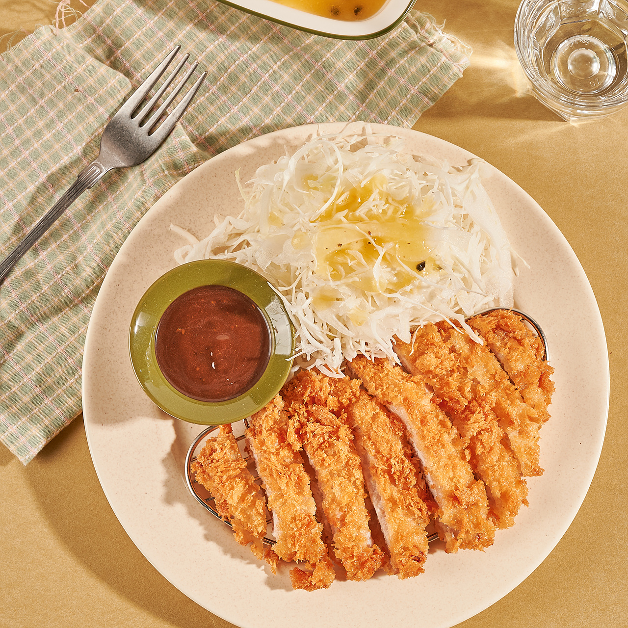 튀긴 돈가스는 철망 등에 올려 기름이 잘 빠지도록 올려준 후, 원하는 소스에 곁들여 먹으면 완성!