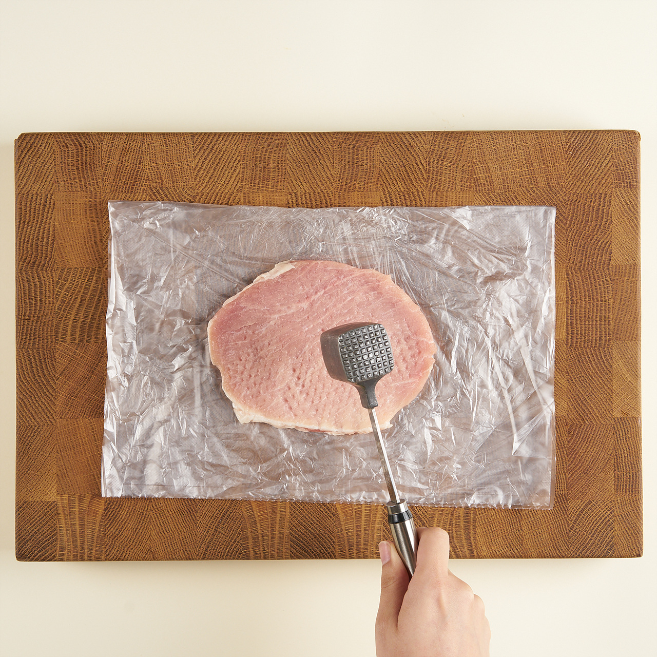 돼지고기 등심(1.2kg/ 1인분당 200g 정도로 손질)은 고기용 망치로 두드린 뒤, 소금과 후춧가루를 약간씩 뿌려 밑간을 해주세요.