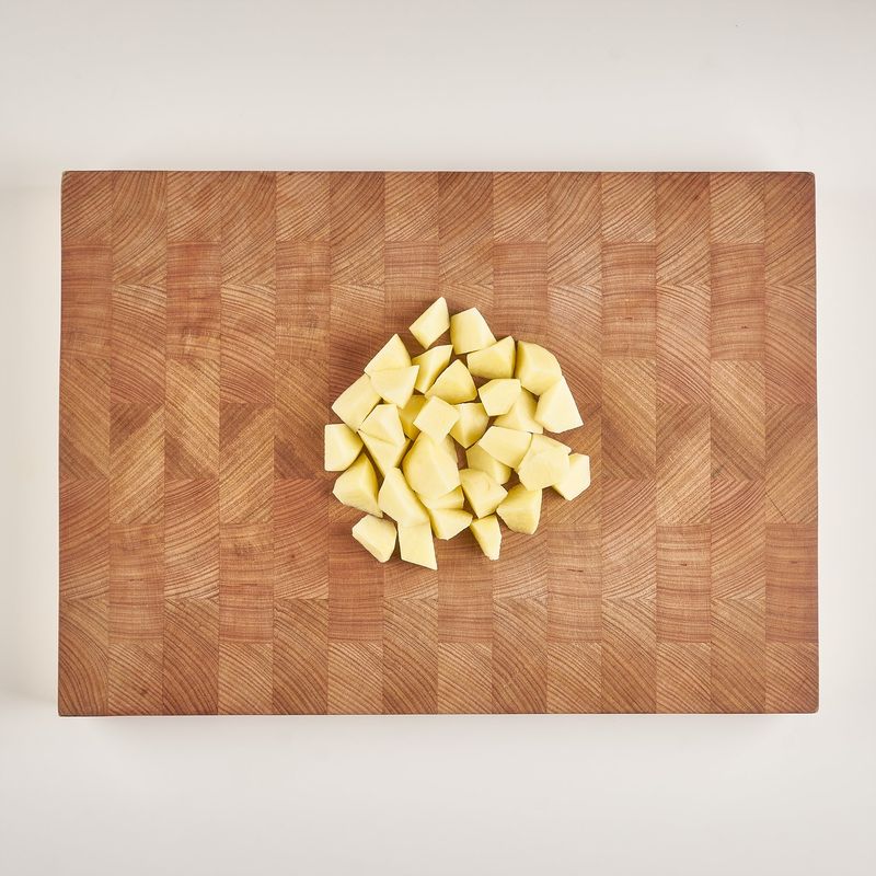 물에 세척한 감자는 필러로 껍질을 벗겨주세요. 그 후 감자를 한 입 크기로 듬성듬성 썰어주세요. (사방 2~3cm)
