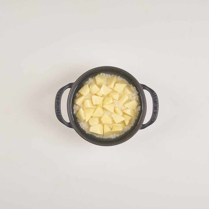 냄비에 불린 쌀과 물, 감자를 넣고 중불로 15분간 가열하고, 약불로 줄여 10분간 뜸들이면 완성!