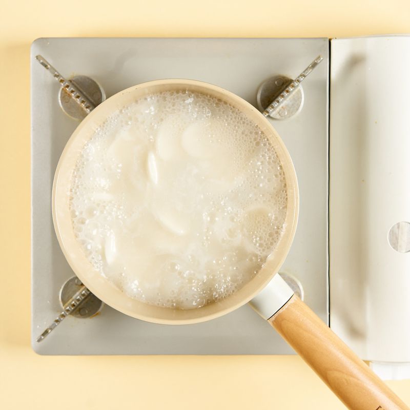 냄비에 연두링과 물을 넣어 센불에 팔팔 끓인 뒤, 떡국떡을 넣고 떡이 말랑해질 때까지 약 5분간 중불로 끓여 주세요.