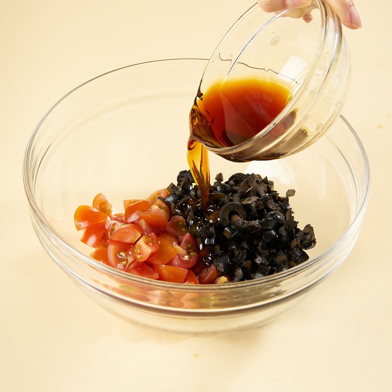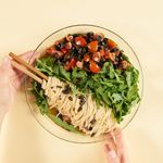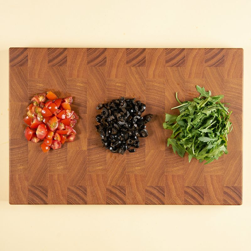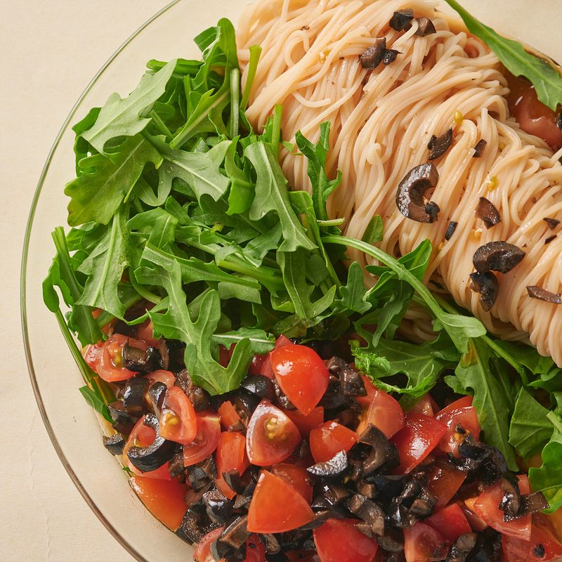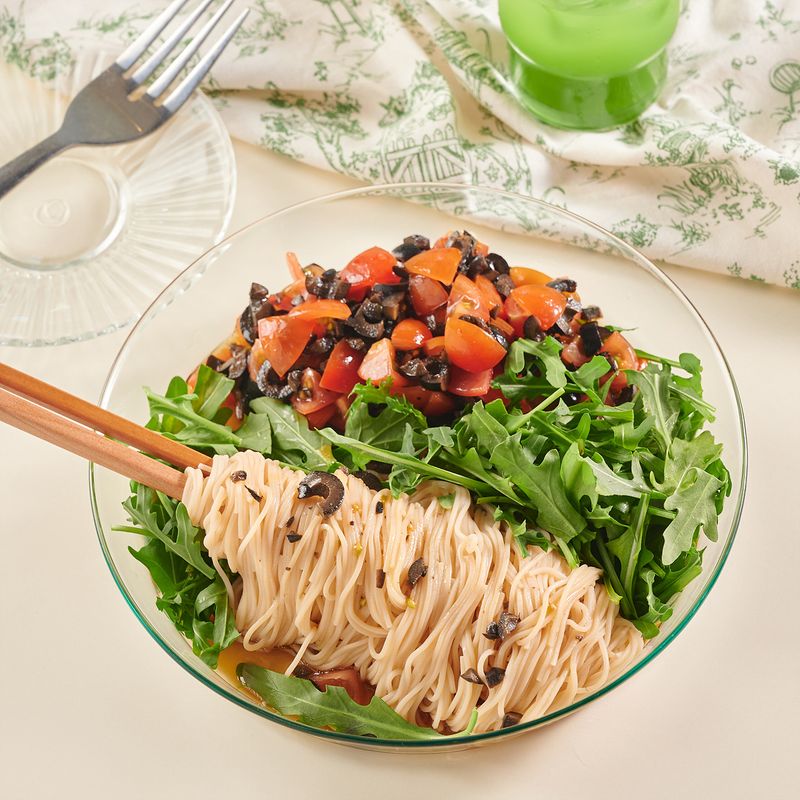 고단백면에 올리브 토마토 절임과 루꼴라 올려