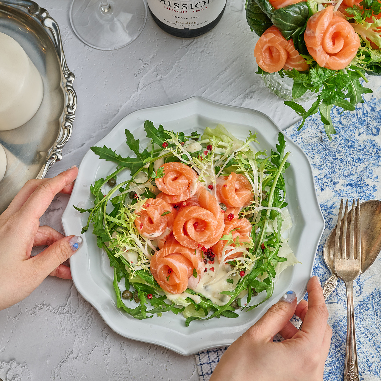 샐러드 채소 위로 돌돌 만 연어를 올려주고, 폰타나 레몬 허브 딜 타르타르 드레싱을 뿌려주면 완성!