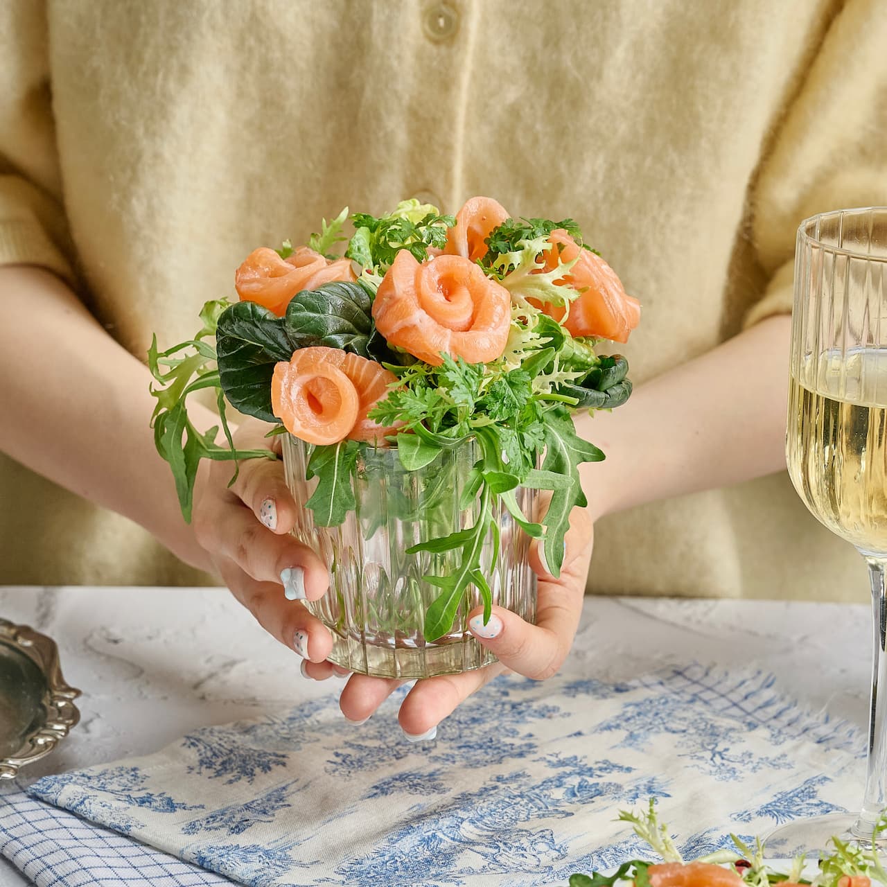 입구가 넓은 컵에 루꼴라, 양파 등 샐러드 채소를 담고 긴 이쑤시개에 양상추와 연어를 꽂아 채소가 담긴 컵에 꽂아주세요. 꽃다발처럼 모양을 낼 수 있어요.