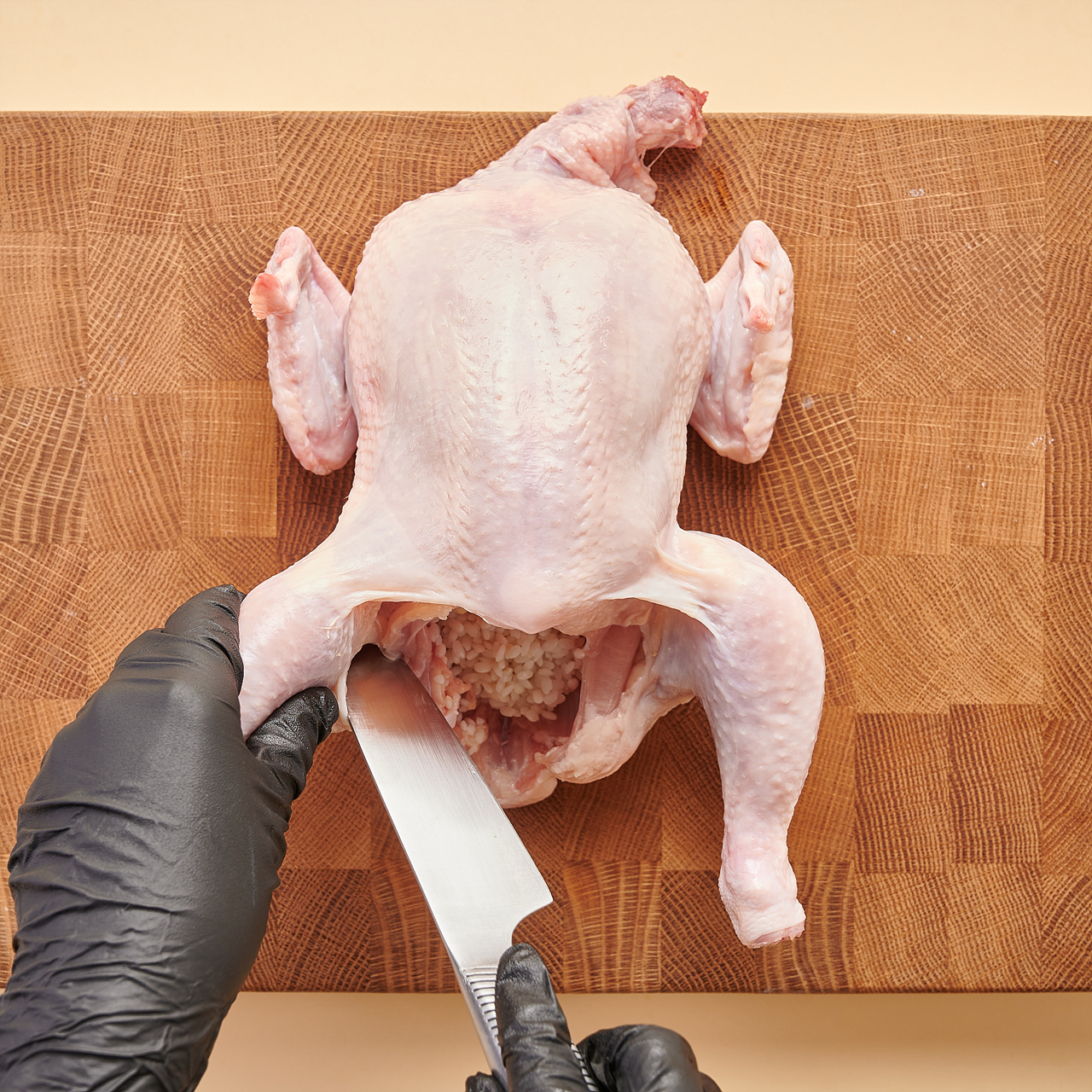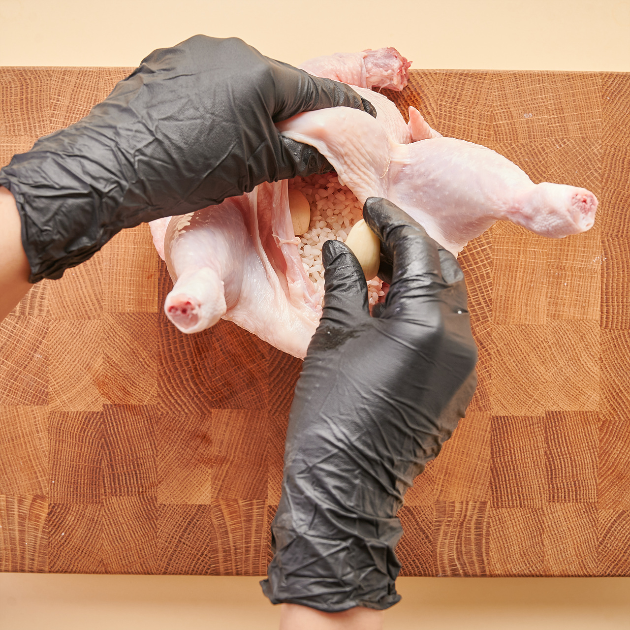 닭고기 뱃속에 마늘(2개), 불린 찹쌀(4스푼)을 넣어 주세요. 닭다리는 엑스자로 고정시켜 주고 날개는 안쪽으로 정리해 주세요.