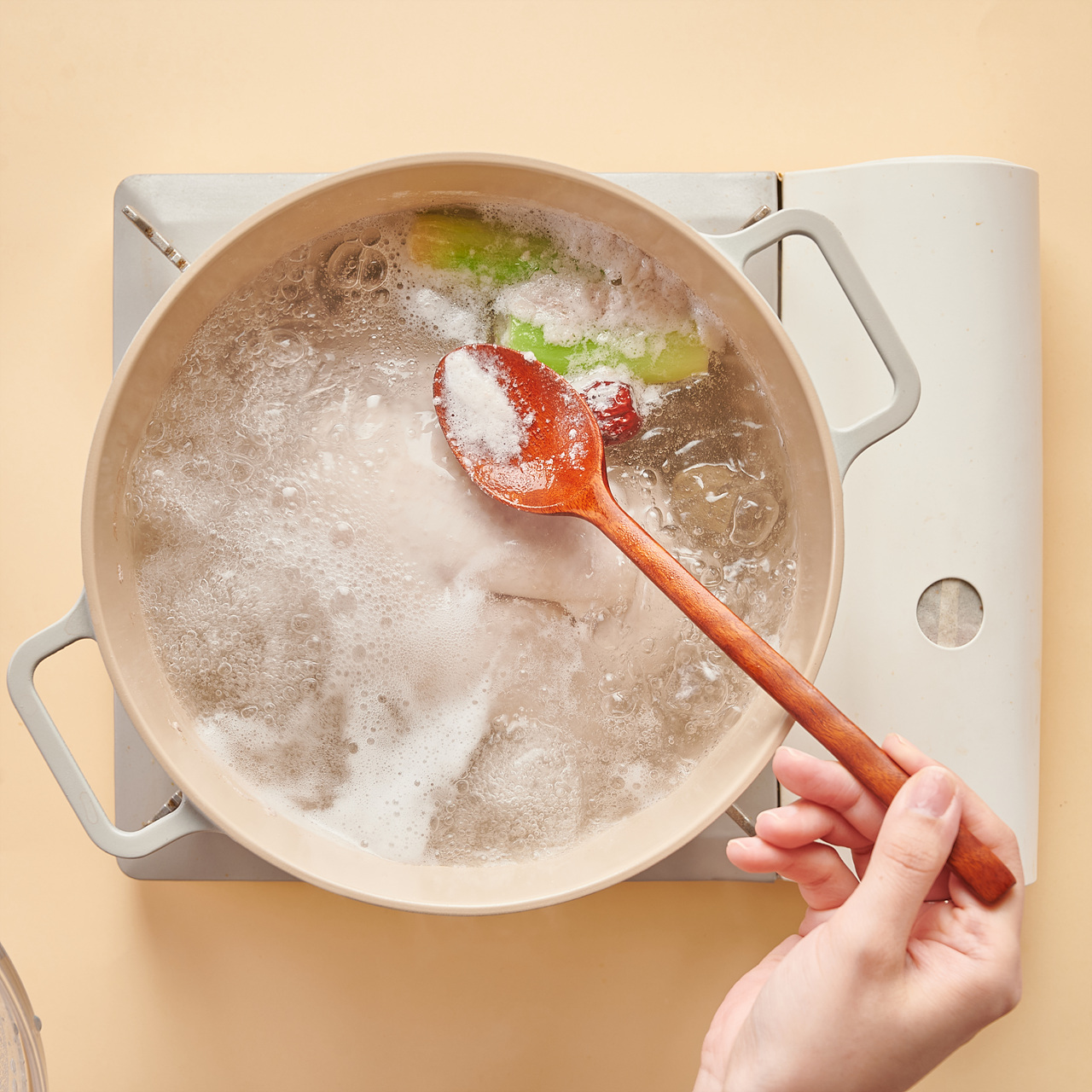 끓는 물에 청주(1스푼), 연두순(2스푼)을 넣고 닭고기를 넣어주세요. 마늘(3개), 밤(2개), 대추(2개), 분량의 대파 2/3를 넣은 뒤 센 불에서 한소끔 끓여 주세요. 물이 끓어오르면 약불로 낮추고 뚜껑을 덮어 20분 정도 끓여 주세요.
