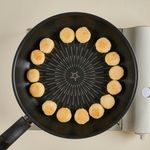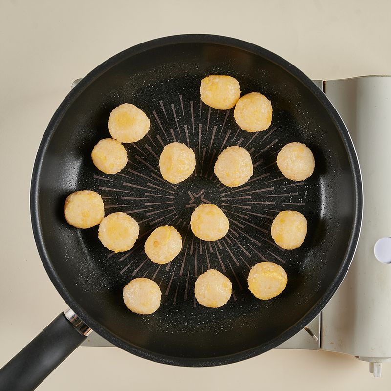 중불에서 1분 동안 예열한 팬에 식용유를 두르고, 달걀물을 입힌 밥알을 올려주세요. 이리저리 굴려 가며 겉이 노랗고 바싹하게 되도록 약 3~4분간 익혀주면 완성!