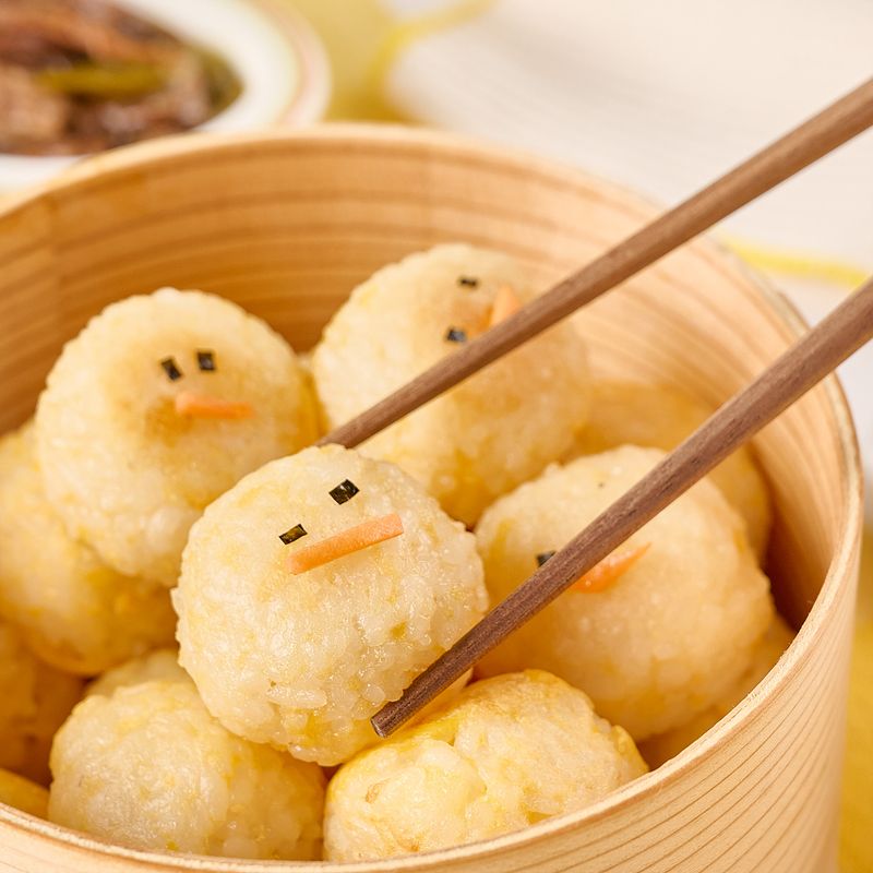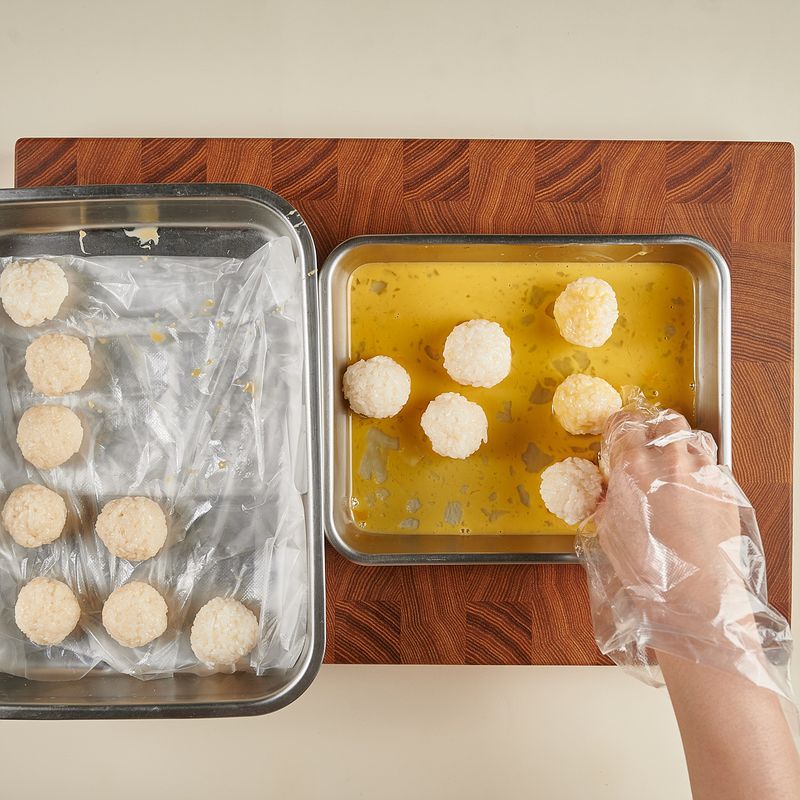 달걀을 볼에 풀어 준비한 후, 동그랗게 만든 밥을 넣어 코팅해 주세요.