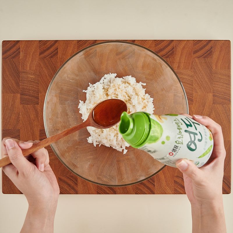 따뜻한 밥에 연두, 참기름을 넣고 힘껏 주물러가면서 충분히 치대 주세요.