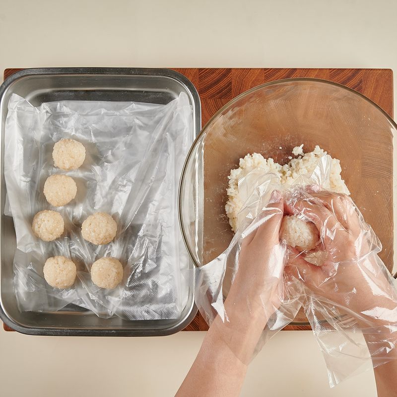 밥을 한입 크기로 동그랗게 만들어 주세요.