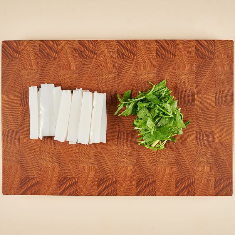 청포묵을 막대모양(5cm 길이 * 1cm 가로 * 1cm 세로 크기)으로 썰어주세요. 깨끗이 씻은 미나리는 4cm 길이로 썰어주세요.