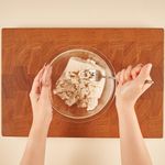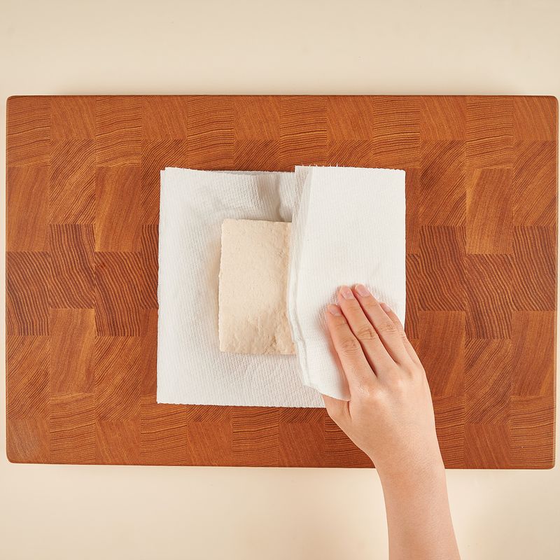 두부는 키친타올이나 면보로 감싸 물기를 제거해 주세요. 포크나 칼로 거칠게 으깨주세요.