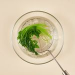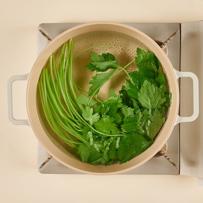 참나물을 깨끗하게 씻은 후, 끓는 물에 넣어 10초 동안 데쳐 주세요. 데친 후, 바로 찬물에 넣어 식히고 손으로 물기를 짜 4~5cm 길이로 잘라주세요.