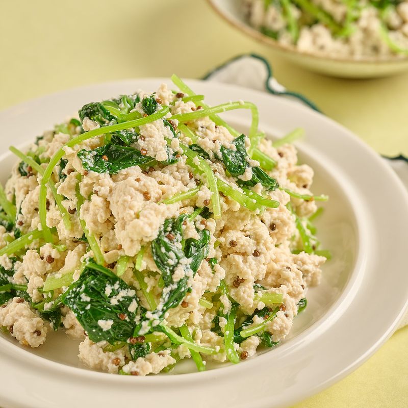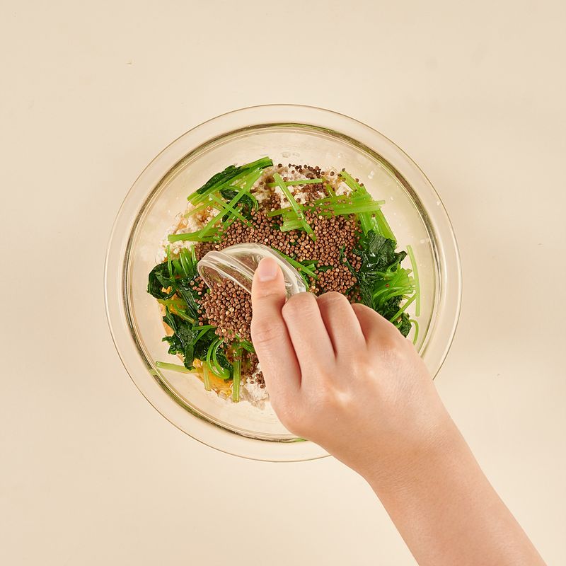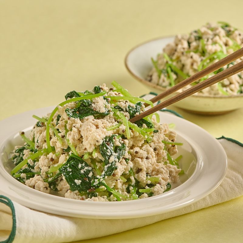 으깬 두부에 데친 참나물, 연두순, 들기름, 통들깨를 모두 넣어주세요. 가볍게 버무려주면 완성!