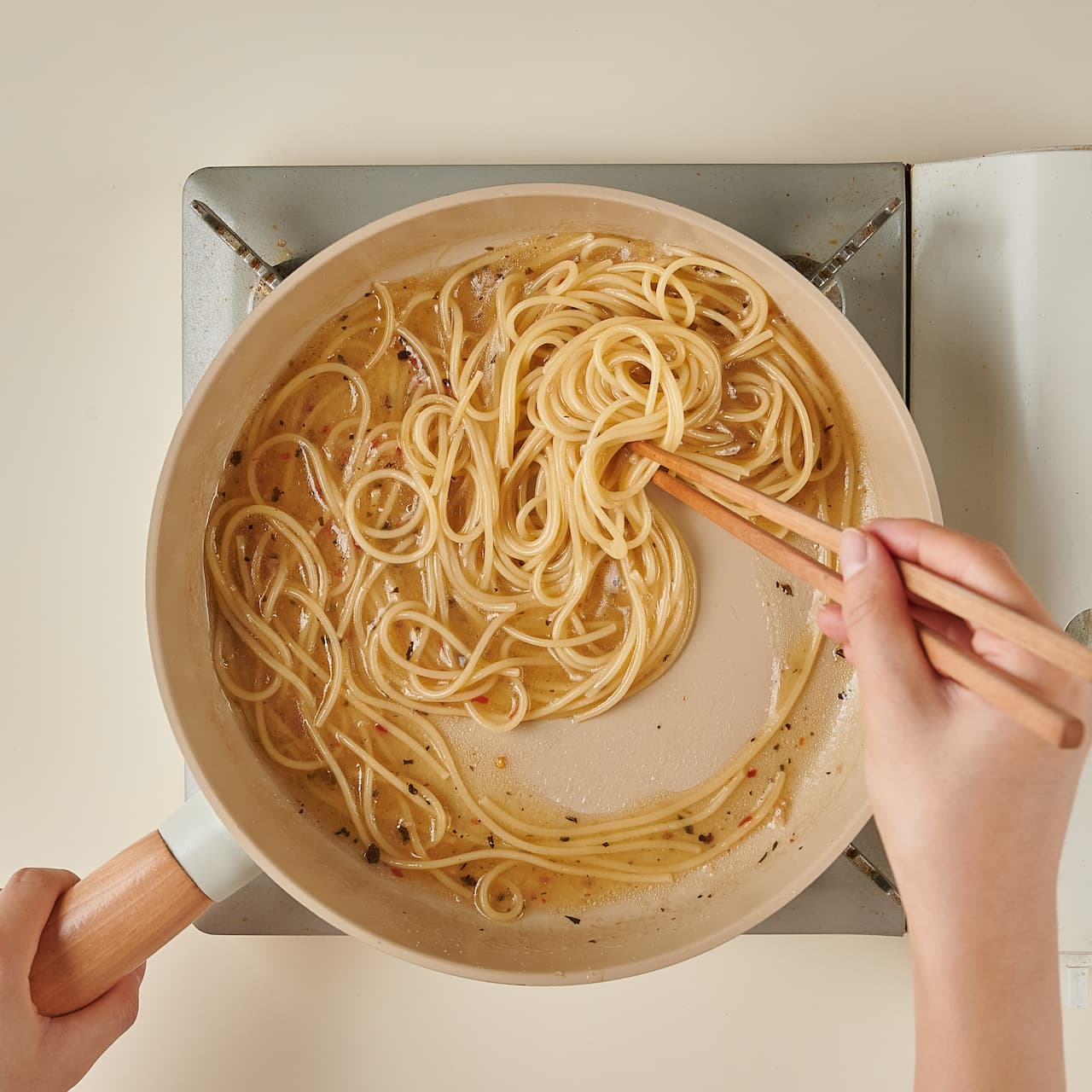 팬에 알리올리오 파스타소스를 1/3병 넣고 센불에서 끓어오르면 중불로 줄여 주세요. 삶아둔 면을 넣고 1분간 잘 섞어주면 완성