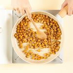 냄비에 병아리콩과 물, 진간장, 설탕을 넣어 센불에서 한소끔 끓여주세요. 재료가 끓어오르면 20분간 중불에서 졸인 뒤 깨를 넣어 고루 섞어주세요. 완성한 소는 병아리콩 입자감이 살짝 있을 정도로 으깨어 준비해주세요.