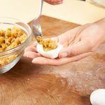 완성된 송편 반죽에 병아리콩 소를 넣어 송편을 빚어주세요. (20개 가량)