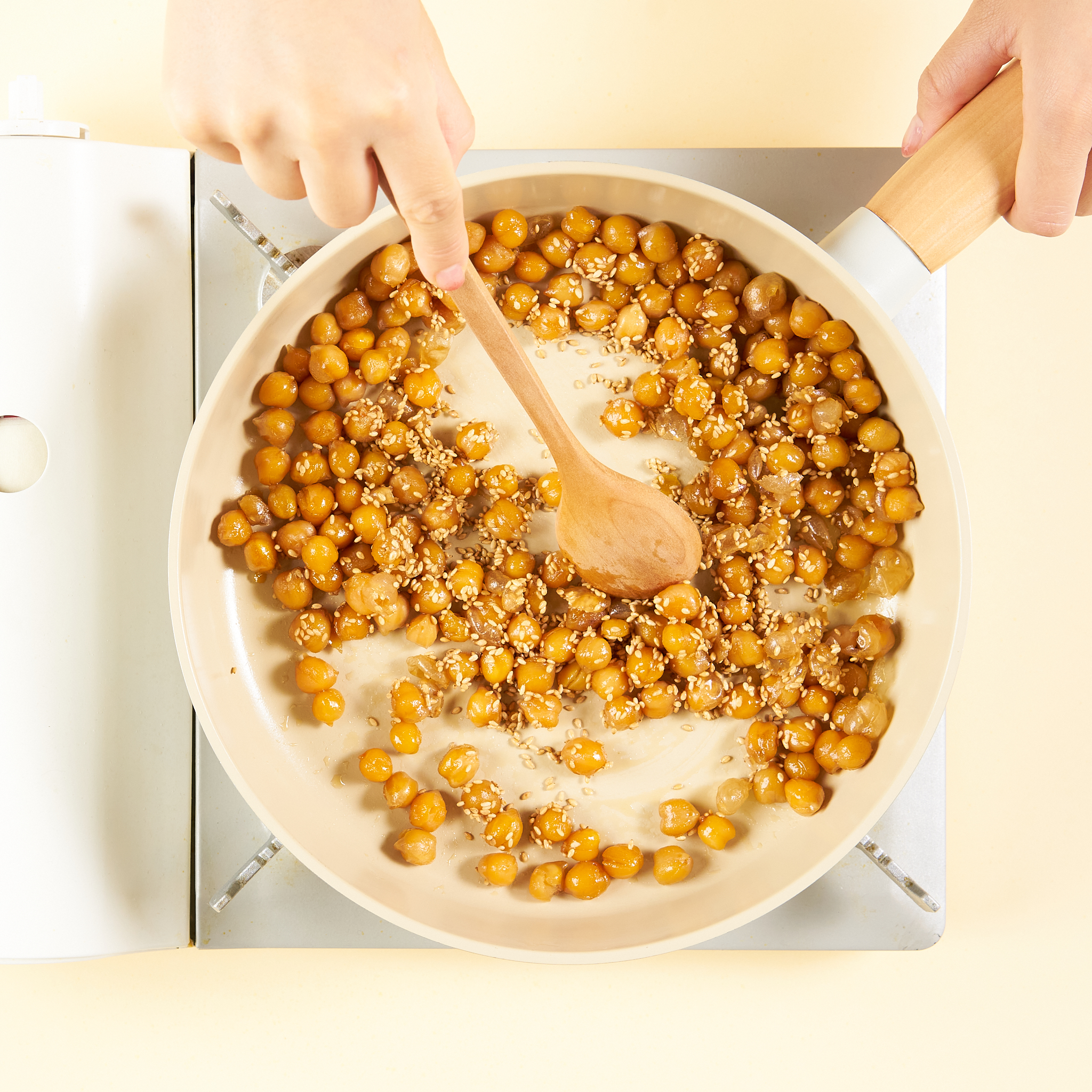 냄비에 병아리콩과 물, 진간장, 설탕을 넣어 센 불에서 한소끔 끓여주세요. 재료가 끓어오르면 20분간 중불에서 졸인 뒤 깨를 넣어 고루 섞어주세요.