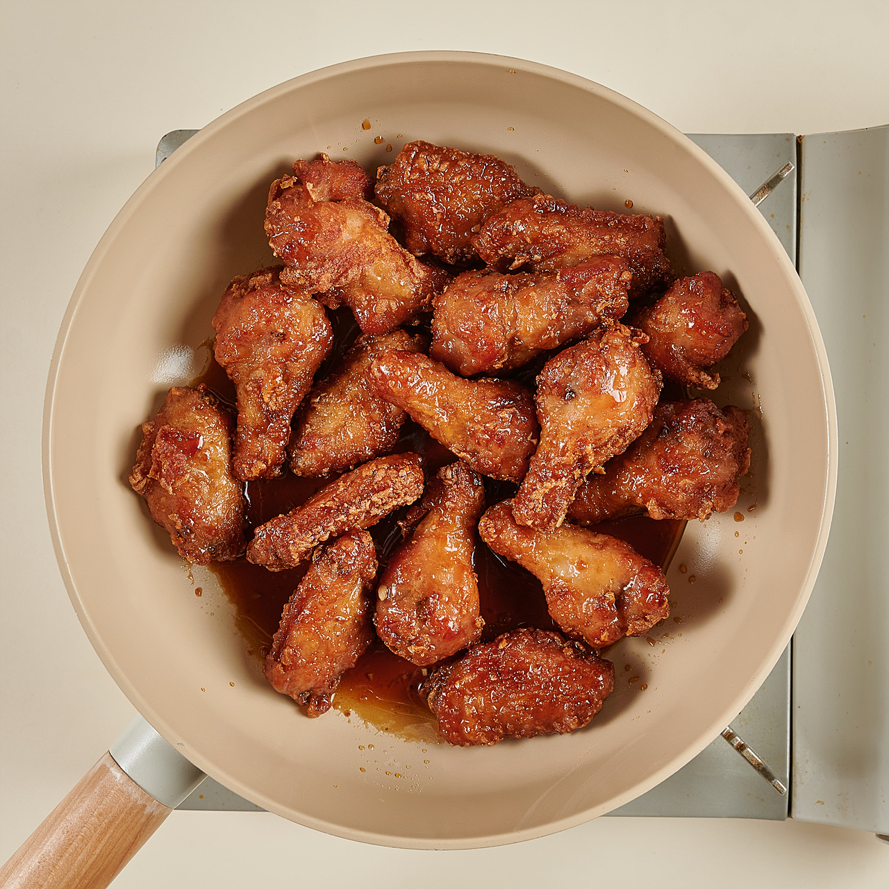 2. 완성된 소스는 남은 치킨 혹은 냉동 치킨과 함께 즐겨 보세요! 센불에 소스를 끓여 소스가 끓어오르면 불을 끄고 치킨을 넣어 섞어주세요.