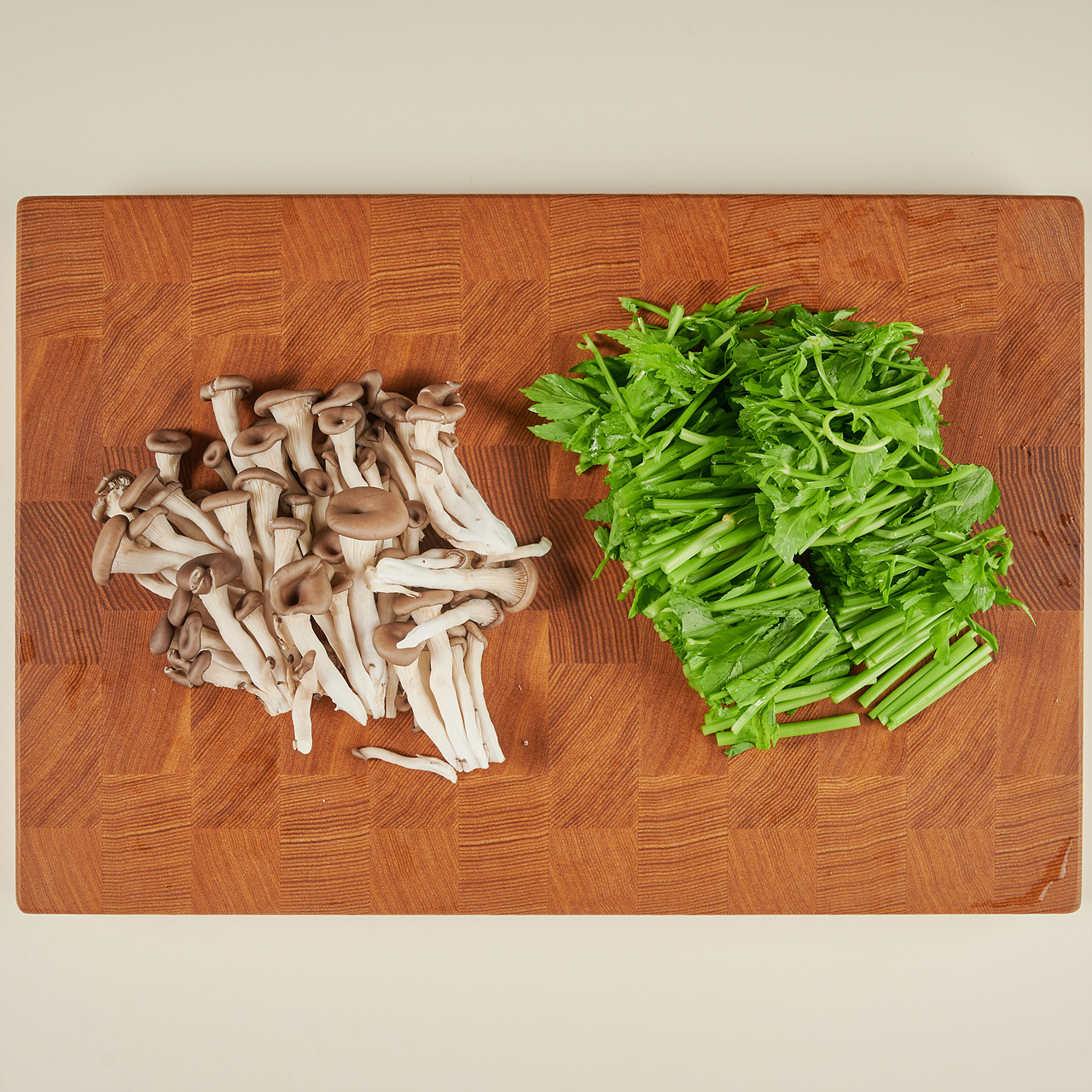 미나리는 깨끗이 씻은 다음, 4cm 길이로 썰어주세요. 느타리버섯은 손으로 한입 크기로 찢어주세요.