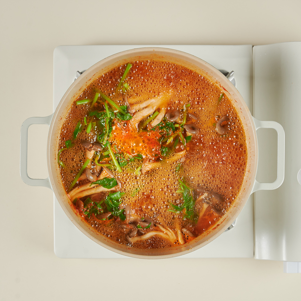 냄비에 물, 연두진, 조선고추장을 넣고 센불에서 팔팔 끓여주세요. 육수가 끓어오르면 미나리와 느타리버섯을 넣어주세요. 육수가 다시 끓으면서 미나리와 버섯이 부드러워질 때까지 1분 정도 더 끓여주세요.