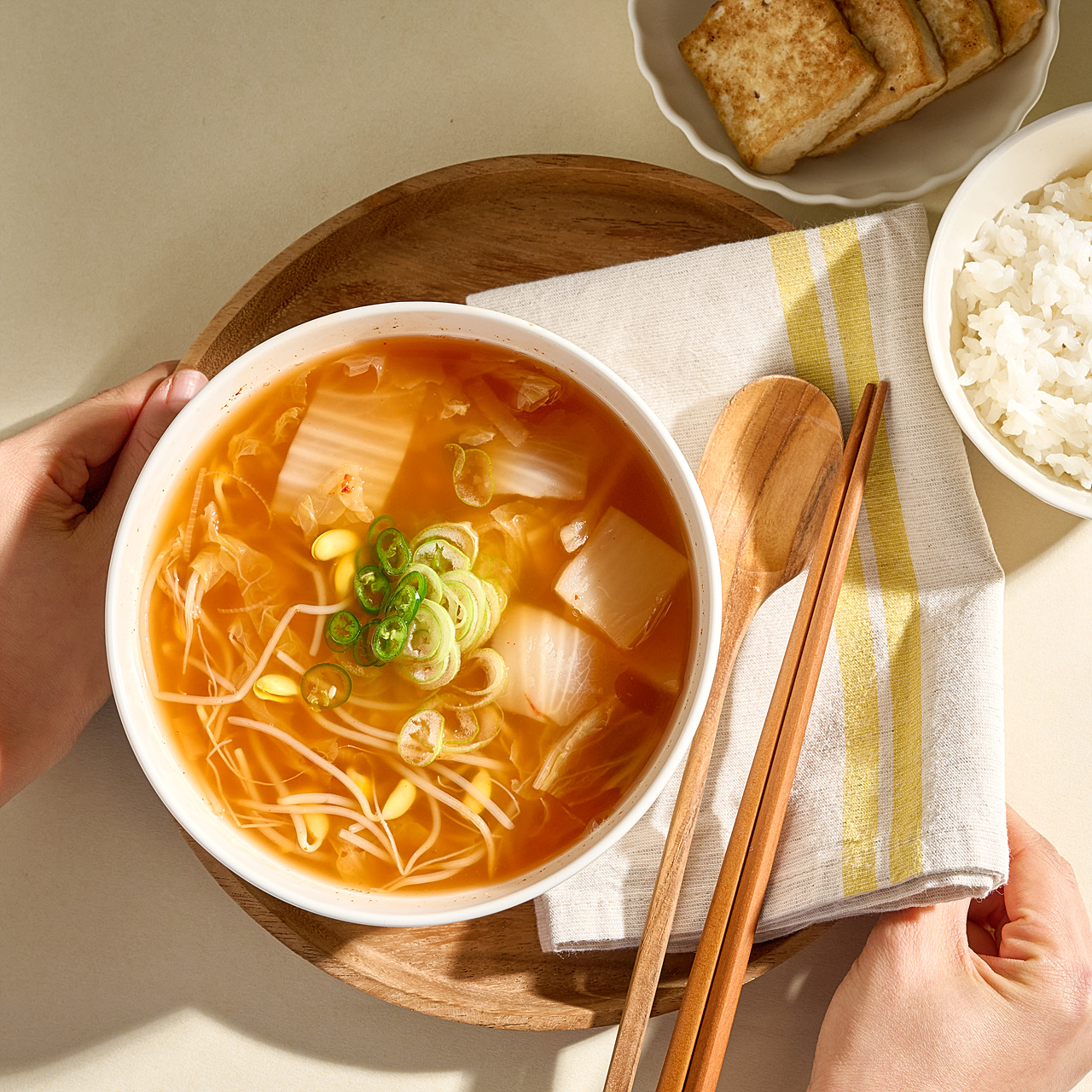 물이 끓어오르면 김치와 김치국물, 콩나물을 넣어 센불에 5분 정도 더 끓여주세요. 불을 끈 후, 먹기 직전에 대파와 청양고추를 넣어주면 완성!