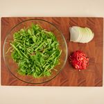 미나리는 깨끗하게 씻은 다음, 5cm 길이로 잘라주세요. 양파는 0.5cm 두께로 채 썰고 홍고추도 가늘게 어슷 썰어 주세요.