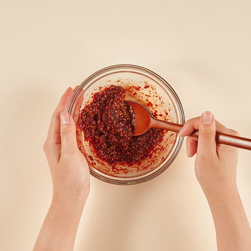 새미네 양파절임소스와 고춧가루, 깨를 볼에 넣어 섞어주세요.