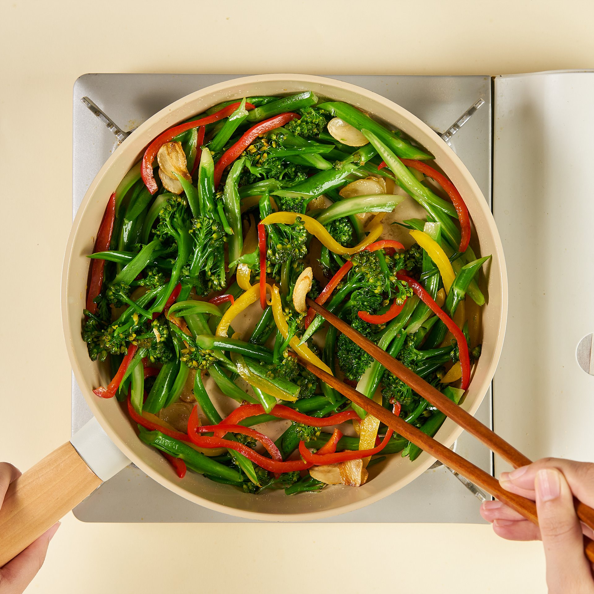 소고기를 뺀 같은 팬에 브로콜리니와 파프리카, 마늘을 넣고 센불로 숨이 죽을 때 까지 2~3분간 볶아주세요.