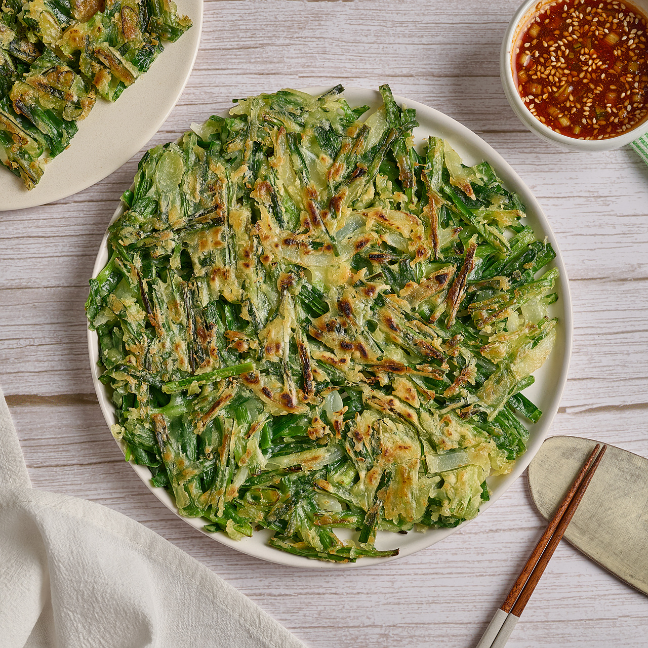 부추전의 아래쪽이 어느 정도 익어서 가장자리 색이 변하고 바삭해지면, 뒤집개로 전을 살짝 들어서 기름이 전 가운데까지 들어가게 해주세요. 전을 뒤집어 황금빛 갈색이 날 때까지 노릇하게 부쳐주면 완성!